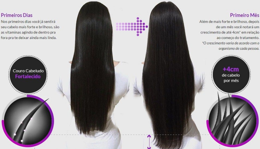 Nos primeiros dias você já sentirá seu cabelo mais forte, macios, saudáveis e brilhoso, são as vitaminas agindo de dentro pra fora antes mesmo de completar um mês, pra te deixar ainda mais linda.