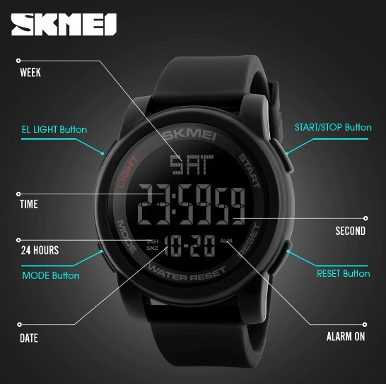 - Exibição: Horas, minutos, segundos, data com dias da semana,